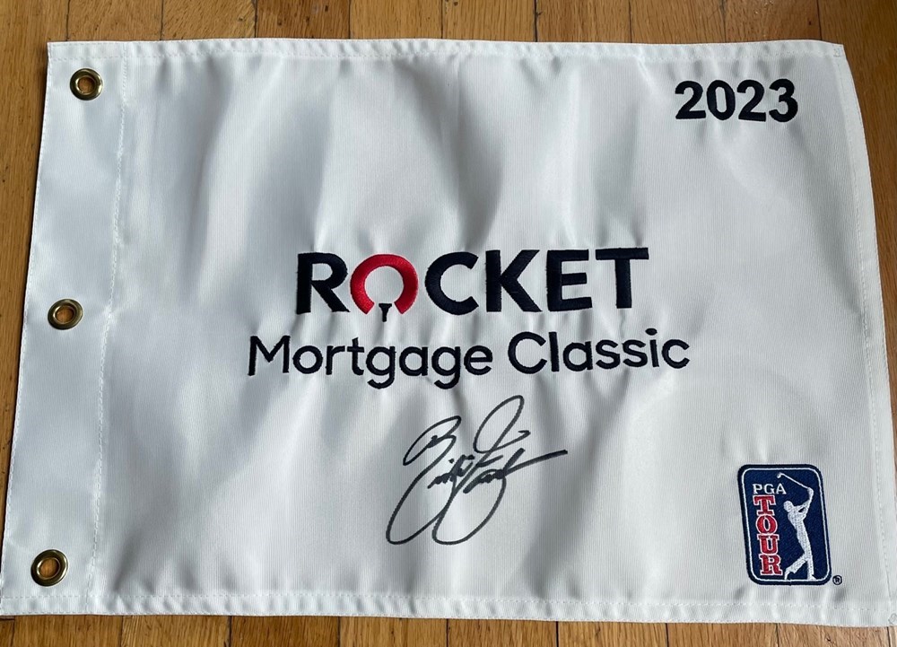 This Rocket Mortgage Classic pin flag has been signed by 2023 winner Rickie Fowler. Take home this unique and rare item to remember this year's tournament.
