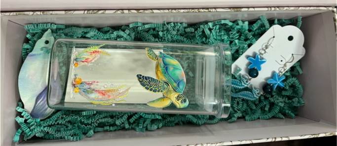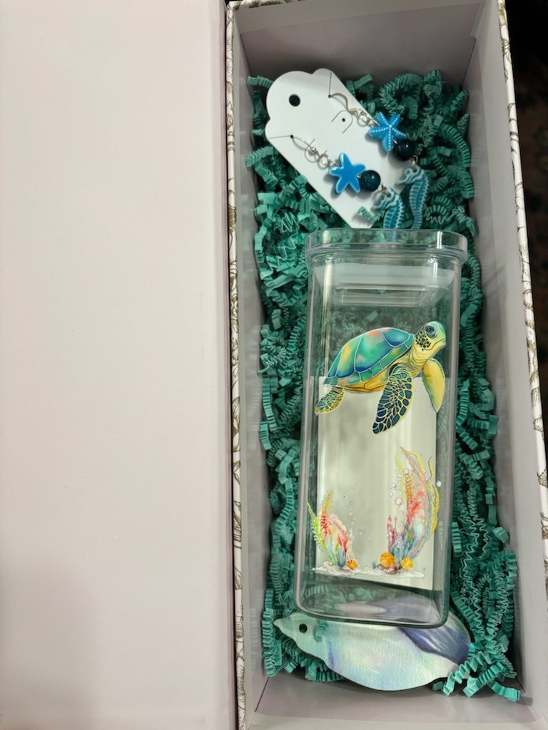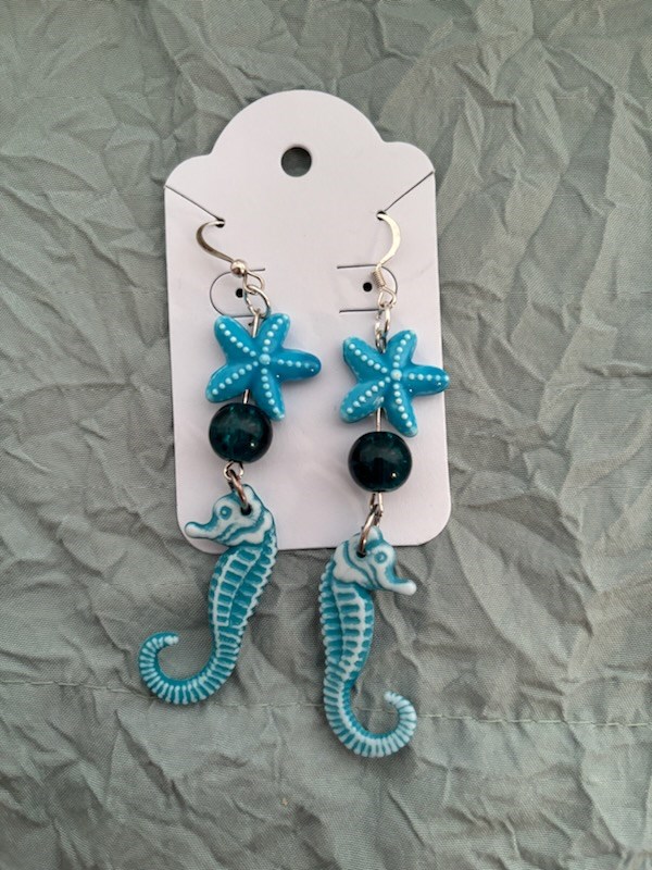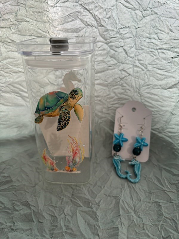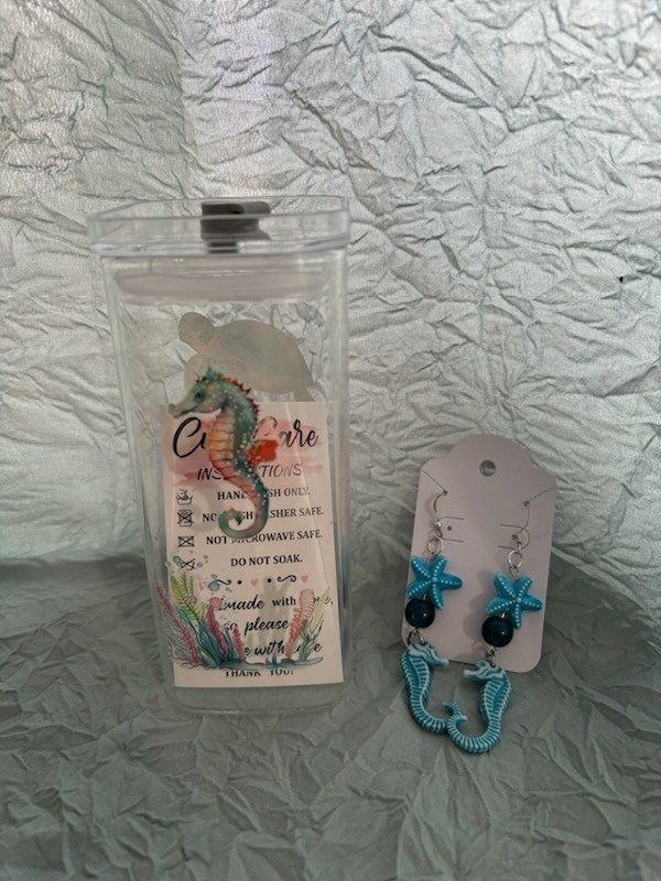 Don't miss out on this unique and custom designed set! Handcrafted with care by Roberta Vallejos, this sea turtle/seahorse cup and seahorse earring set inspires the undersea lover in all of us! Care instructions included in the cup. Estimated Retail Value: Cost of materials $20, handcrafted with care PRICELESS